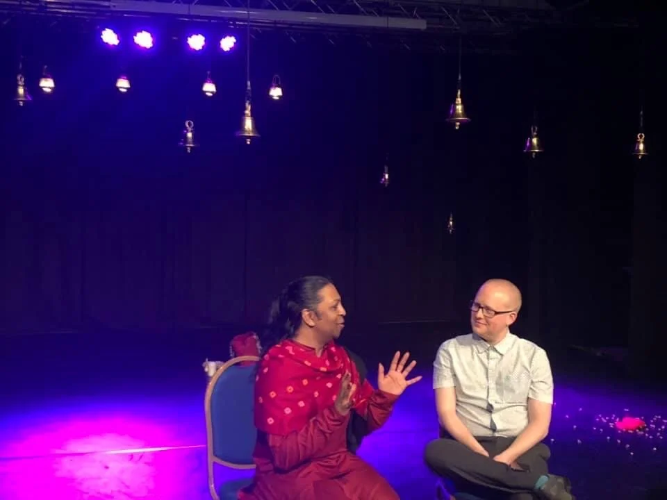 Jaivant Patel speaking to Alex Croft (Creative Director, Kala Sangam) during the post-show Q&A of YAATRA’s preview performance ay Kala Sangam in May 2019